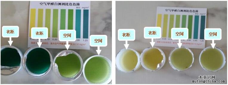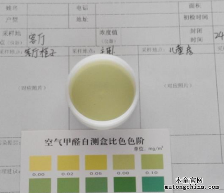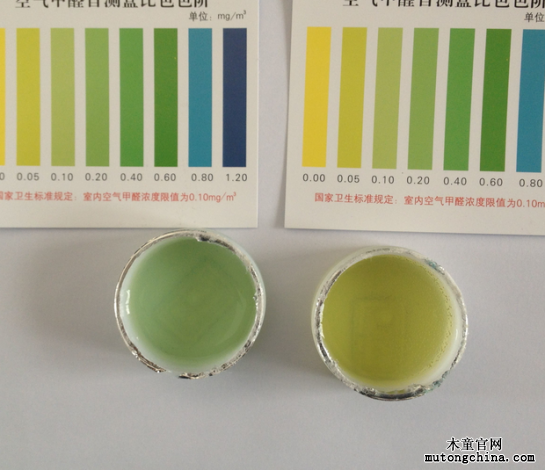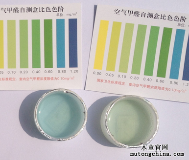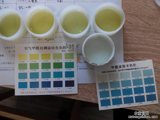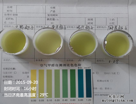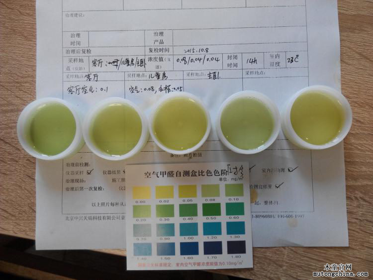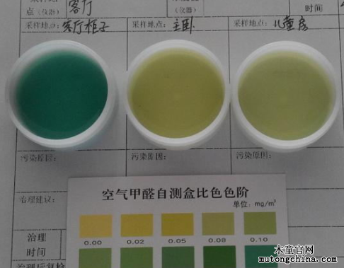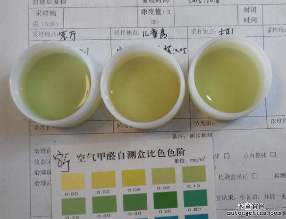 這張照片是濟南木童環保科技公司在客戶家中治理甲醛污染之前,用甲醛自測盒檢測的結果,其中藍綠色(0.8左右)的是客廳柜子里的檢測結果,中間偏黃色(0.05左右)的是主臥室空間的結果,右邊換綠色(0.1左右)的是兒童房空間的結果。