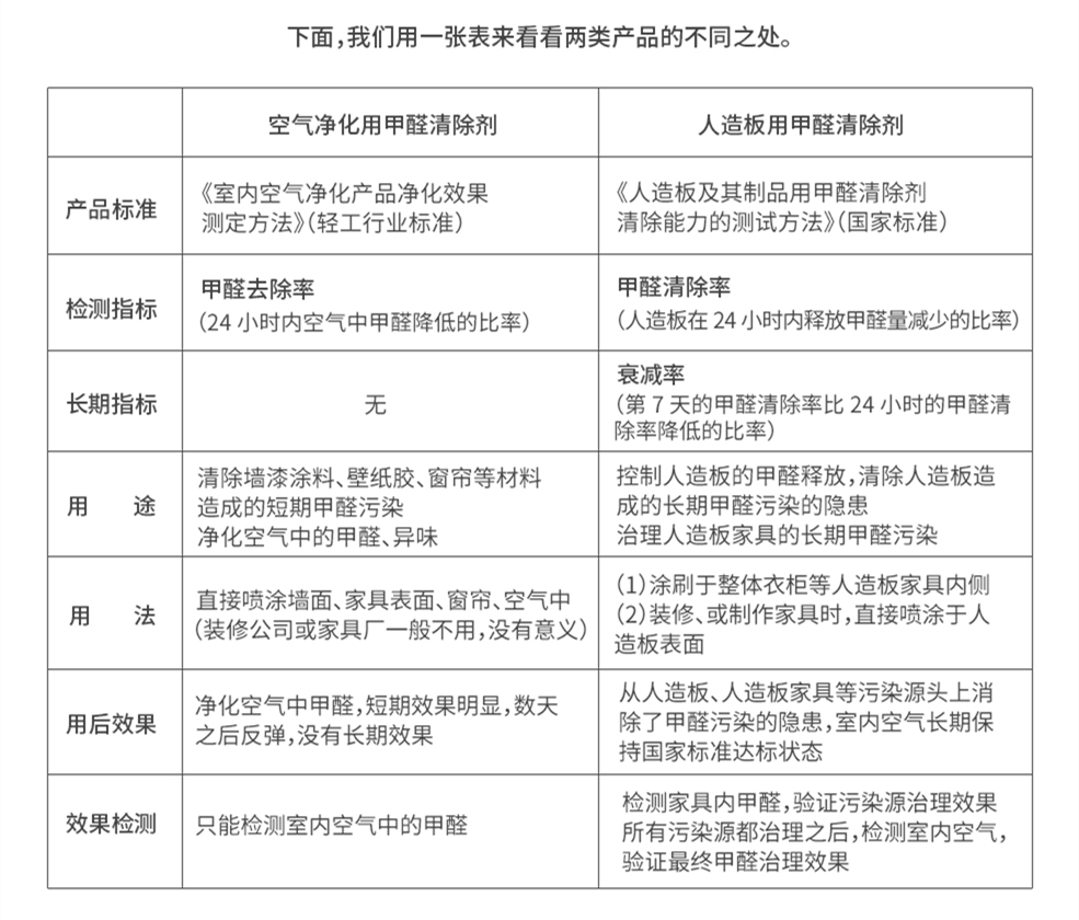 針對墻漆涂料、壁紙膠等短期甲醛污染源的產品,就是空氣凈化用甲醛清除劑;針對人造板、人造板家具等長期甲醛污染釋放源的產品,就是人造板用甲醛清除劑。兩類產品針對的污染源不同,對效果的要求也完全不同,買錯、用錯后果很嚴重。