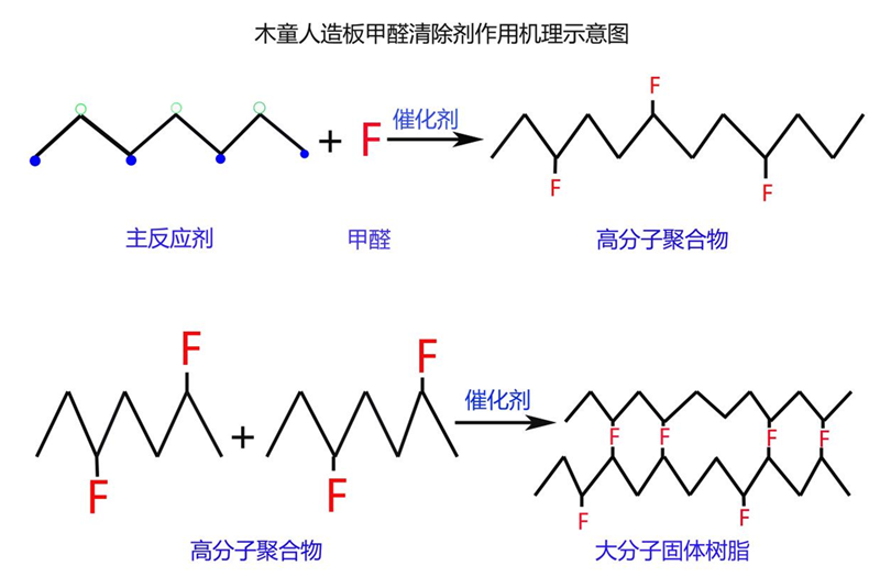 產品在水和滲透劑的帶動下,進入板材表層內部中,水分蒸發后有效成分留在內部均勻分布,內部分解揮發的游離甲醛遇到產品,無需任何輔助條件下即可將其捕捉并通過化學共價鍵接枝聚合生成穩定不可逆的無毒無害、耐酸堿、耐腐蝕、耐高溫的高分子固體聚脂物,從而在家具板材內部將甲醛快速徹底清除;在輔反應劑的作用下,殘留的少部分甲醛被催化劑協同反應清除;隨著反應進行,生成的固體樹脂物不斷堆積在板材的內部縫隙通道內,有效隔絕了外界的水汽和熱能進入板材內,從而徹底消除了人造板脲醛樹脂遇潮遇熱分解釋放游離甲醛的條件。我們內部反應型產品,有效避免了封閉劑短期不除根,催化劑要等揮發出來表面反應的效果不理想,普通高分子只捕捉不聚合等弊端缺陷。只要產品有效成分未反應完,與甲醛的捕捉聚合反應清除過程就可以持續不斷進行,從而達到穩定的長期效果。