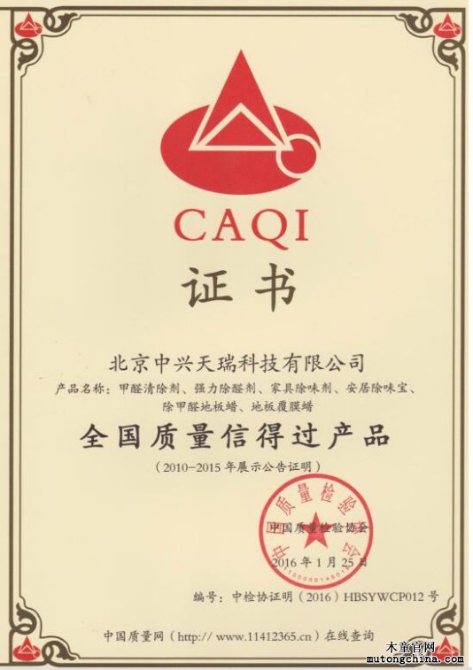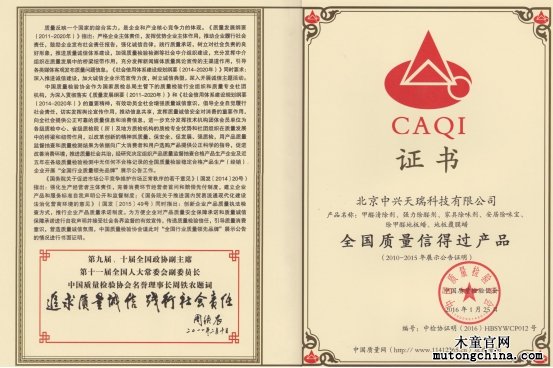 在多年的抽檢、送檢等各項檢驗中,木童系列產品均符合國家標準,而且治理效果安全高效不反彈,是此次獲得殊榮的基礎,并由中國質量檢驗協會在《中國質量網》、《中國消費網》、《中國經濟網》上進行榮譽展示公告,并向全國各級質量技術監督部門、有關質量檢驗機構廣泛贈閱。