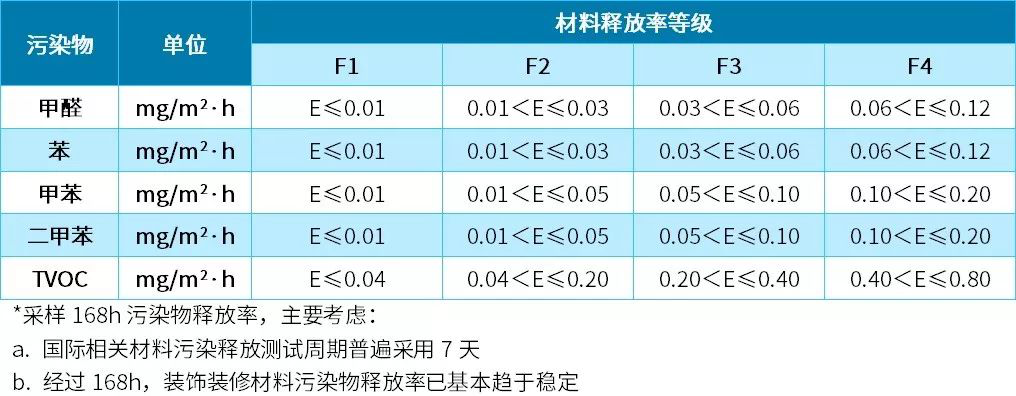 《標準》以材料和部品測試或計算所得的168小時(7天)對應的污染釋放率作為依據,將裝飾裝修材料及部品環保性能分為四個等級。采用污染物釋放率作為材料環保性能的評價,能更直觀的反映材料對空氣質量影響,通過分級便于比較材料環保性能和有助于選擇配置材料。