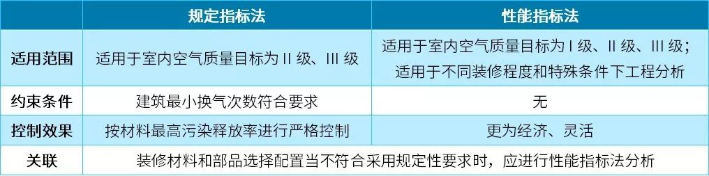 《標準》首次提出裝修污染物控制設計的理念和方法,在裝修設計階段,以室內空氣質量控制目標為導向,綜合設計方案、材料特性、通風狀況、裝修進度等要素,對室內裝修污染進行定量計算評估,并對污染源頭進行解析,合理制定各類材料尤其是主要材料/部品的污染物釋放率要求,作為裝修工程實施環保質量控制的設計依據。《標準》提出了可作為簡化手段、保證在最不利條件下室內空氣質量能滿足要求的“規定指標法”,和基于污染物模擬計算、可提供更為經濟、靈活的解決方案的“性能指標法”。