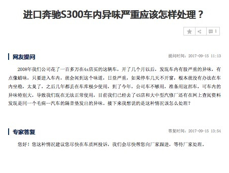 通常來說,奔馳應該汲取教訓,積極找出車內“異味”根源,杜絕新款車型中再次出現同樣的問題,避免更多的車主深受其害。但是從下文中這位新奔馳新款E級車主的遭遇中可以看出,當年大規模爆發的“異味門”事件并未引起奔馳公司的高度重視,奔馳新車車內空氣質量問題屢被投訴。