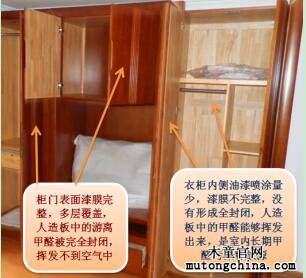油漆家具內(nèi)表面(內(nèi)側(cè)),噴漆量少,也很少打磨。內(nèi)表面看上去沒有外表面的光澤,摸上去略感粗糙,說明漆膜不完整,沒有起到全封閉作用,不能完全封閉人造板中的甲醛釋放,人造板中的游離甲醛從漆膜微細的破損處揮發(fā)出來,形成污染。