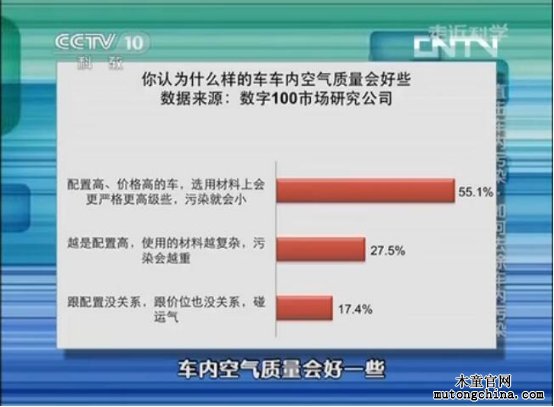 關(guān)于“你認(rèn)為什么樣的車車內(nèi)空氣質(zhì)量會(huì)好一些”的調(diào)查顯示(如上圖):55%的人認(rèn)為,配置高、價(jià)格高的車,污染就會(huì)小。這樣的“認(rèn)為”是否正確呢?